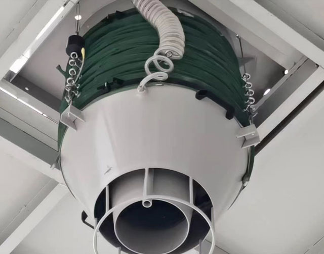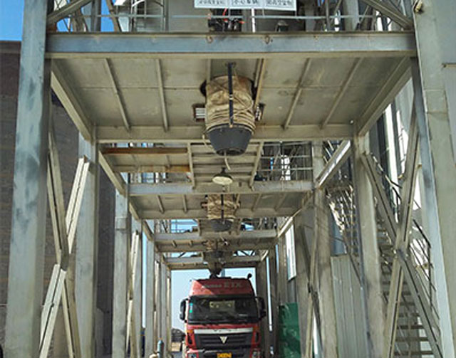 汽車散裝機(jī)由電控箱、電動機(jī)、減速機(jī)、滑輪組伸縮管、吸塵管、鋼絲繩等主要部件組成。通過鋼絲繩、吸塵管把它們連接到一起,形成可伸縮的結(jié)構(gòu)。汽車散裝機(jī)可與料庫下給料設(shè)施聯(lián)鎖運(yùn)行,料車裝滿后,自動停止裝料,實(shí)現(xiàn)裝卸過程自動化,裝車效率高、粉塵污染少。